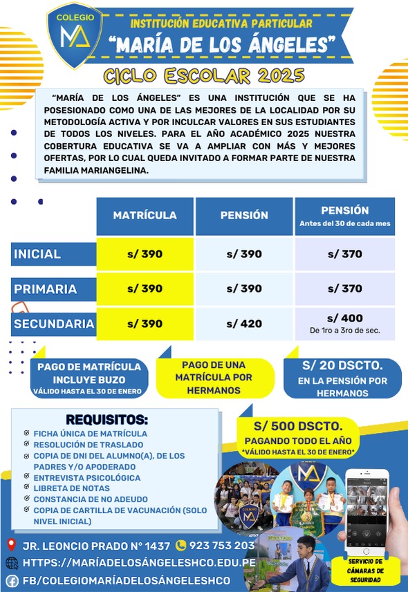 La institución Educativa Privada María de los Ángeles es una institución que garantiza una educación de calidad en valores morales y espirituales formando educandos plenamente creativos y responsables en la comunidad local, regional y nacional.